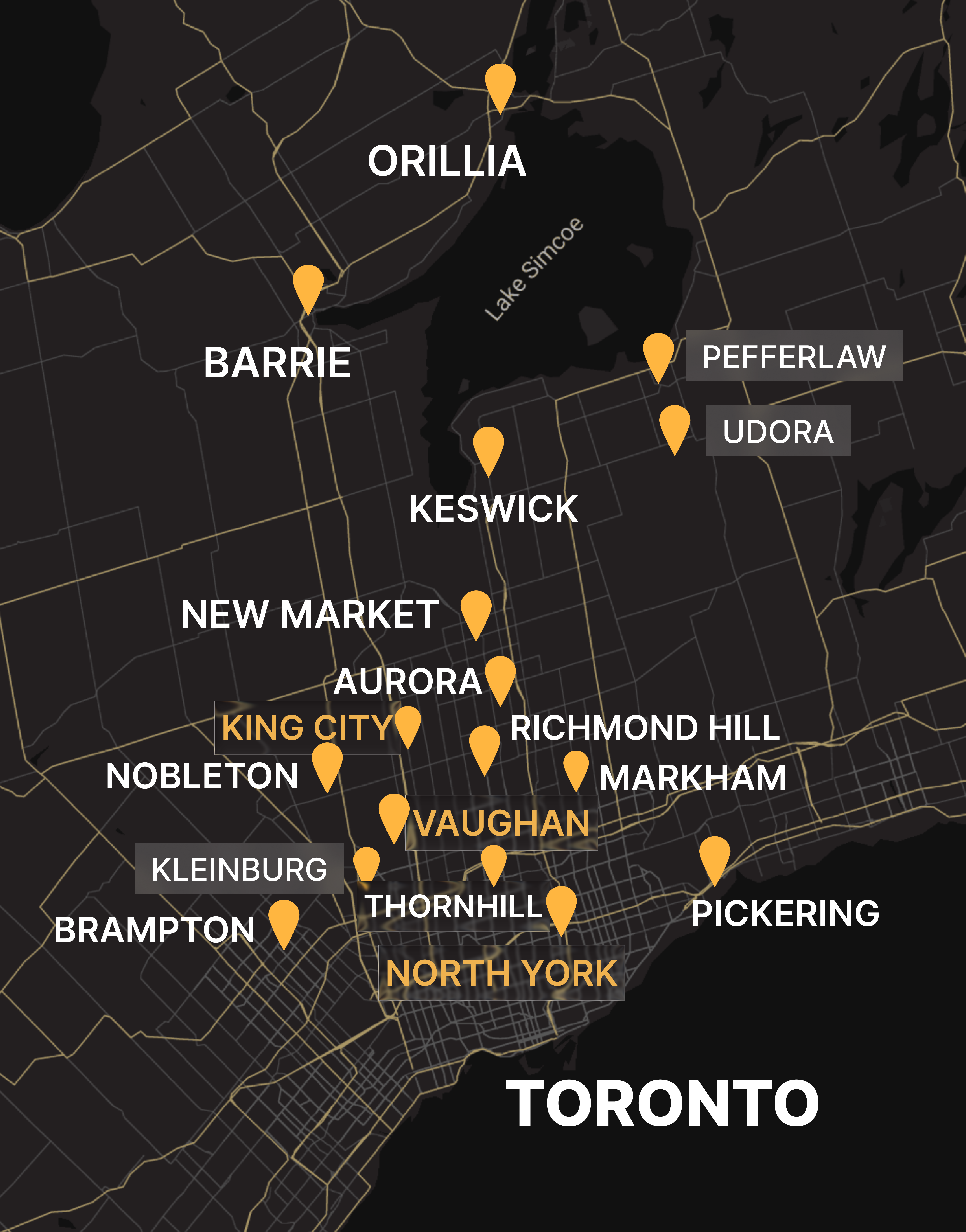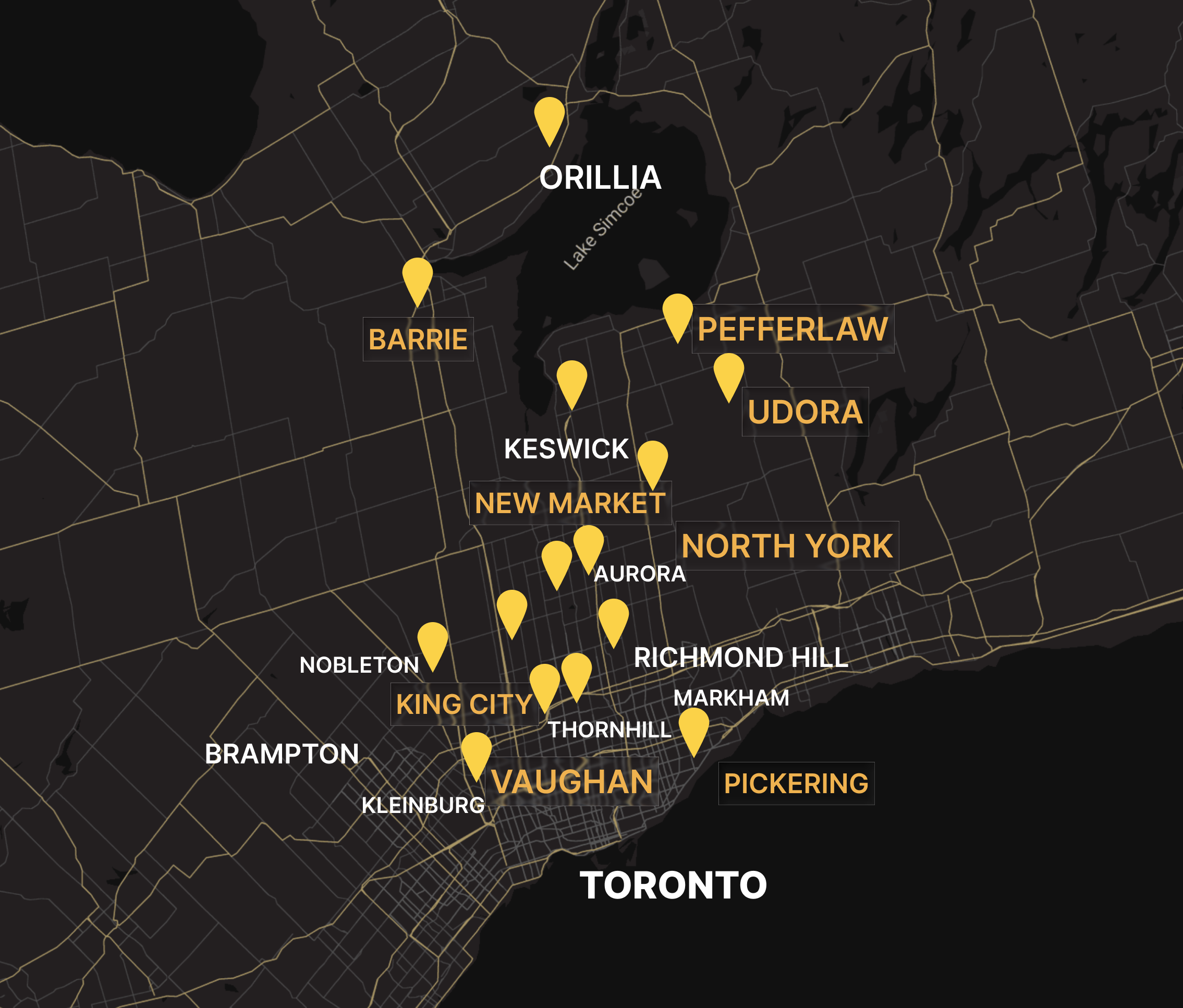 We operate from Toronto north through Newmarket to Orillia. You can follow our ready projects map.